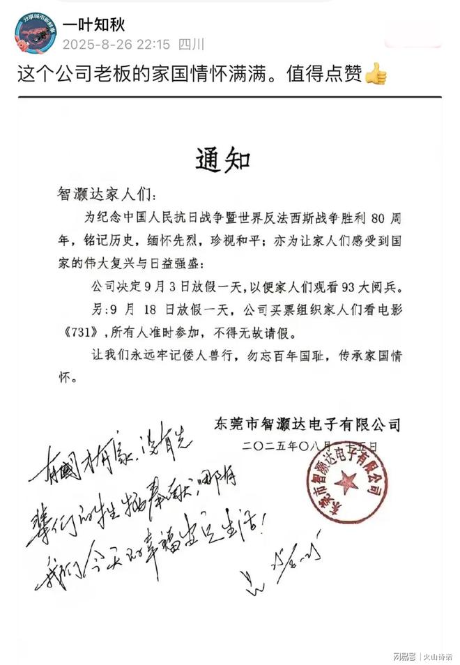 最近,一些互联网用户透露,公司负责人充满了家庭和国家的感觉。值得给拇指!通知Zhihaoda的家人:为了纪念日本入侵和中国抵抗世界反法西斯战争的胜利80周年,请记住历史,纪念和欣赏武术家。这样一家人就感觉像是该国的重新振兴和力量:该公司决定在9月3日休假,以便他们可以看到第93次军事游行。此外:9月18日,该公司购买了门票来组织他们的家人观看电影731。所有人都准时,不允许无故说再见。永远记住日本野兽的行为。不要忘记羞辱人们100年,并继承家庭和国家的感受。 2025年8月25日的通知,Dongguan Zhihaoda Electronics Co.,Ltd.According公司,该公司向Gener展示了该公司Al情况,在9月3日和9月18日为所有员工带来了假期,要求所有员工都可以通过军事游行和电影“ 731”而看到。此外,看电影是公司的组织,不需要缺席。在签署警告时,我的老板给我写信说,我只有一个国家就有家人。没有祖先的牺牲和奉献精神,今天我们将过上幸福而稳定的生活!一些互联网用户对该主题发表了评论,并批准了爱国者Lu的负责人。如果您有感情,这家公司必须活跃!但是,一些互联网用户直接指出,酋长将在9月1日首先补充员工的社会保障。这对于社会保障至关重要,而不是付款是非法的。成立于2015年,去年仅向三名员工支付了社会保障。爱员工从社会保障的付款开始。根据公共信息,Dongguan Zhihaoda Electronics Co.,Ltd。建立在Janu2015年2月28日,注册资本为100万元。法律代表是刘·舒姆(Liu Shumei)。商业范围包括研究,开发和销售:电子产品,硬件产品。从现在开始,事实证明,这是一个小型且新近建立的微型舞会,老板有这样的感觉,值得认可。巧合的是,最近对Shandong Jining Weilong食品公司的内部通知一直在引人注目。 9月18日,整个工厂被暂停了一天,我们一起看到了“ 731”。甚至衣服也是规定的。让我们看一下此在线通知。该通知的中心内容是该公司将庆祝电影展览活动,并将在9月18日暂停一天。此外,所有人员行情都列出了有关纪律和电影服装的要求。一般的要求是维持严格,这是一种爱国教育,使我们想起历史并从中学到。理解电影《 731》的最后一张海报最近发行了!这部电影“ 731”将于9月18日正式首映。这部电影讲述了一名日本入侵者的故事,他在反日战争胜利的前夕杀死了人类的实验,进行了细菌战争调查,主要是在Jiangxi省的Pingfang区。这两家公司停止努力看电影的公司记得促进历史或对公司进行故意展示。无论是什么动力,至少这一次,都有更多的人看到它。每个外观都有对历史的记忆。所有人物都是那个黑夜的无声证词。发现真相,保护记忆并在将历史悠久的重量转换为有效的时候。值得等待,看和记住!呢您如何看待这个?