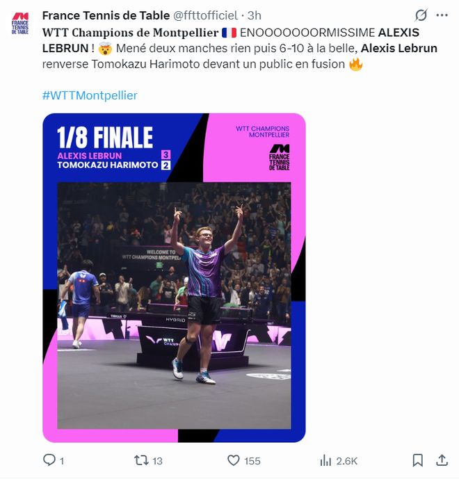 WTT蒙彼利埃锦标赛男单16强中,本土选手亚历克斯·勒布朗复出,以3-2击败日本选手张本智和。这场战斗令人心碎。 22 岁的勒布朗击败了同代人的领袖张本智和。因为张本智和世界排名第四,法国媒体一片哗然。大乐的乒乓球天赋其实不如弟弟小乐,但他在主场球迷的掌声中一点点弥补了差距。他们以9-11、10-12、11-4、11-9和12-10的五场比赛比分从0-2落后的状态中恢复过来。法国媒体写道:“勒布朗在决胜局挽救了四个赛点,完成了翻盘。”对于勒布朗来说,这是一个美好的夜晚。法国媒体:决胜局达雷必须挽救四个赛点,他做到了。大乐晋级八强。法媒:戴尔在蒙彼利埃锦标赛16强中实现了这一壮举,挽救了4个赛点并击败了世界排名第4的选手张本智和。法国记者:场面非常激动人心。德尔大比分0-2落后,决战6-10落后,但大逆转。他晋级男单四分之一决赛。法国媒体:德勒就是这么做的,在决胜局挽救了四个赛点。在蒙彼利埃,他们连续第二年进入四分之一决赛。他创造了属于他自己的辉煌之夜。赛后,大勒布朗在他的X上写道:“很棒的比赛。”感谢所有支持我们的人。比赛继续。 WTT官方还发布了德勒赛后庆祝的照片。世界排名第13位的德勒在决胜局中以0胜2负、6胜10负处于劣势,但成功翻盘。我知道你喜欢法国乒乓球史上的一场史诗般的比赛。戴尔创造了奇迹。