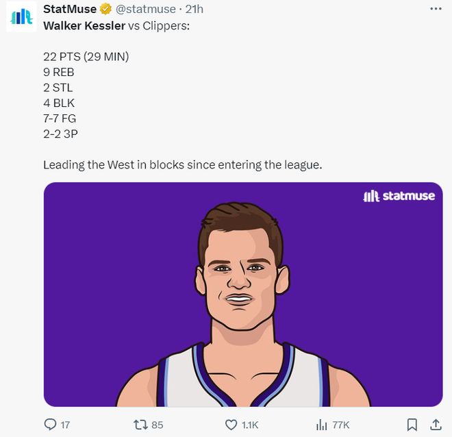 赛季揭幕战对阵快船队,沃克·凯斯勒出战29分钟,拿下22分9篮板2抢断4盖帽,三分球7中7、三分球2中2,投篮命中率100%,真实投篮命中率120%。凯斯勒并不害怕面对祖巴茨。关键是他一直在练习三分球。整个湖人媒体都对凯斯勒的进步感到惊讶。当凯斯勒这样身材和吨位的内线前锋拥有进攻技巧和三分球命中率时,他的上限可能会无限高。今年夏天爵士队不再与他续约,湖人队将受益匪浅。美国记者:对于邦赞在场上的疯狂举动我一点也不感到惊讶,但人们却很难相信,因为凯斯勒的整体表现直接击败了快船队。他投中了所有三分球。爵士本来可以以相对较低的价格续约他。湖人队记者瑞恩·鲁埃达在观看了凯斯勒的表现后发送了凯斯勒的统计数据和@lakesofficial:尽一切努力将凯斯勒带到湖人队与卢卡·东契奇搭档。艾顿的常规赛首秀令人失望。身高2.16米的内线却没有战斗的勇气。身高1.98米的柴萌突破了3秒大关。比赛前34分钟,他7投5中得到10分、6个篮板、4次失误和1次盖帽。他多次在防守上做出贡献,但不在篮下。实在是太软了。由于凯斯勒的表现已经如此出色,有消息称湖人队媒体LADE有意提高凯斯勒的交易报价。爵士队一定对这个报价感到满意。湖人相当于梭哈,送花蜜,2027年顶级保护前4,2030年首轮交易权,2030年无首轮保护,首轮交易+2个首轮选秀权。如果凯斯勒能够来到湖人队,他们就可以交易掉艾顿这样的内线。湖人队进行更多交易以继续有助于提高他们的防守。你也可以开始了。海耶斯作为替补中锋非常有效。这一切都取决于佩林卡的决定。